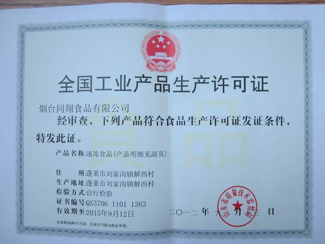 2012年9月  當(dāng)社は順調(diào)にQS審査を通過した、食品生産許可証を受けた、會(huì)社の製品を販売できることになります、範(fàn)囲は全國(guó)の各地域及びインターネットで。