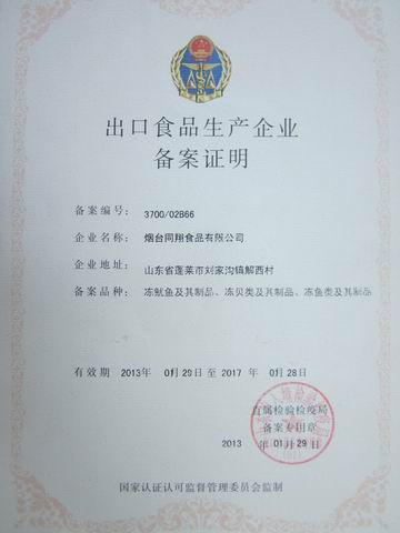 2012年3月、蓬萊市海洋と漁業(yè)局張洪波局長(zhǎng)がリーダーとして,各主要リーダーイニングを連れて、弊社へ見學(xué)指導(dǎo)の仕事で、弊社張義強(qiáng)社長(zhǎng)を接見した報(bào)告を與え、席上張局長(zhǎng)が同翔食品の肯定致しました、同翔食品がもっと強(qiáng)く、大きくで、勵(lì)まして、これとともに「蓬萊市漁業(yè)協(xié)會(huì)副會(huì)長(zhǎng)業(yè)者」を授與しました
